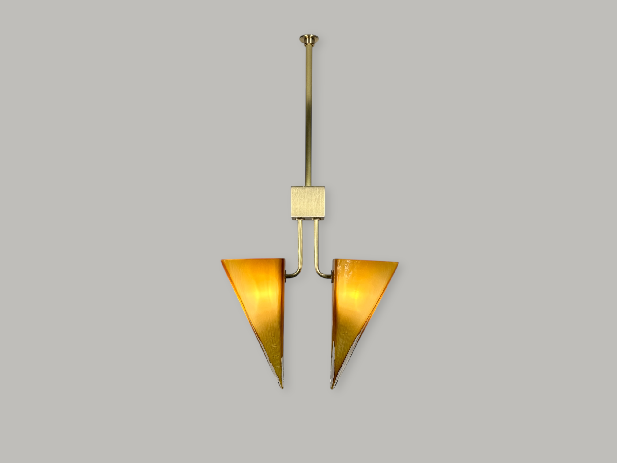 The hand crafted trapezoidal glass cones and architectural brass provide a beautiful directional glow exuding an elemental simplicity.